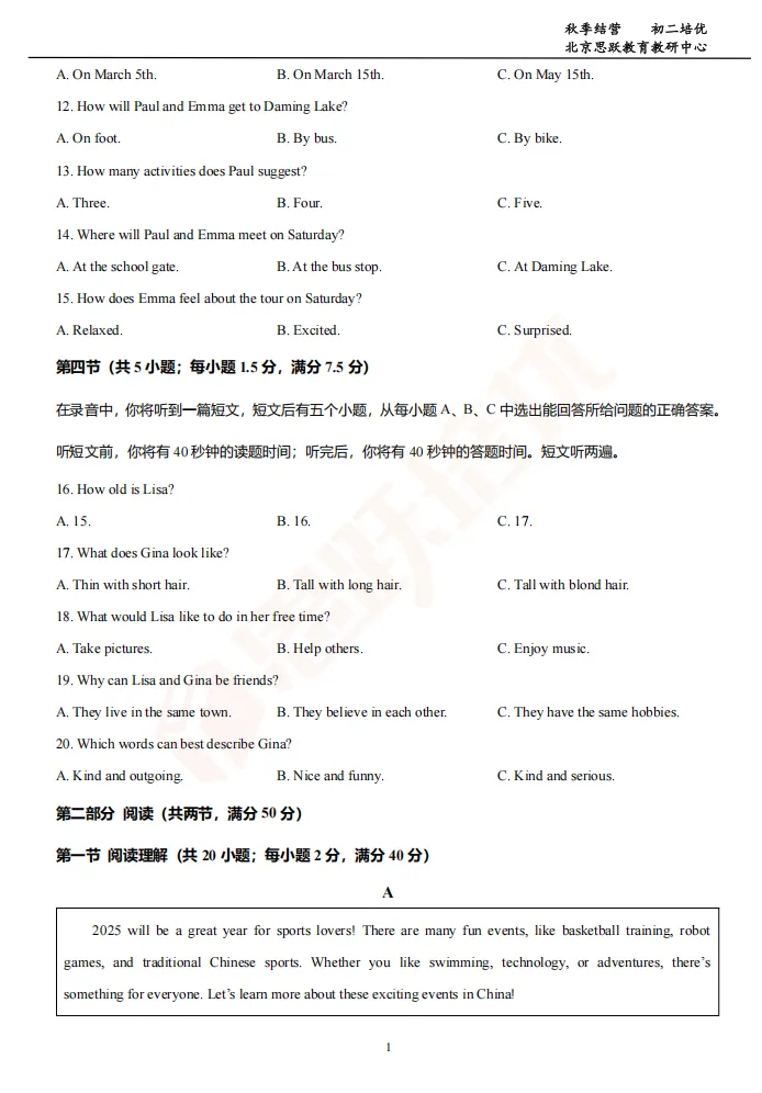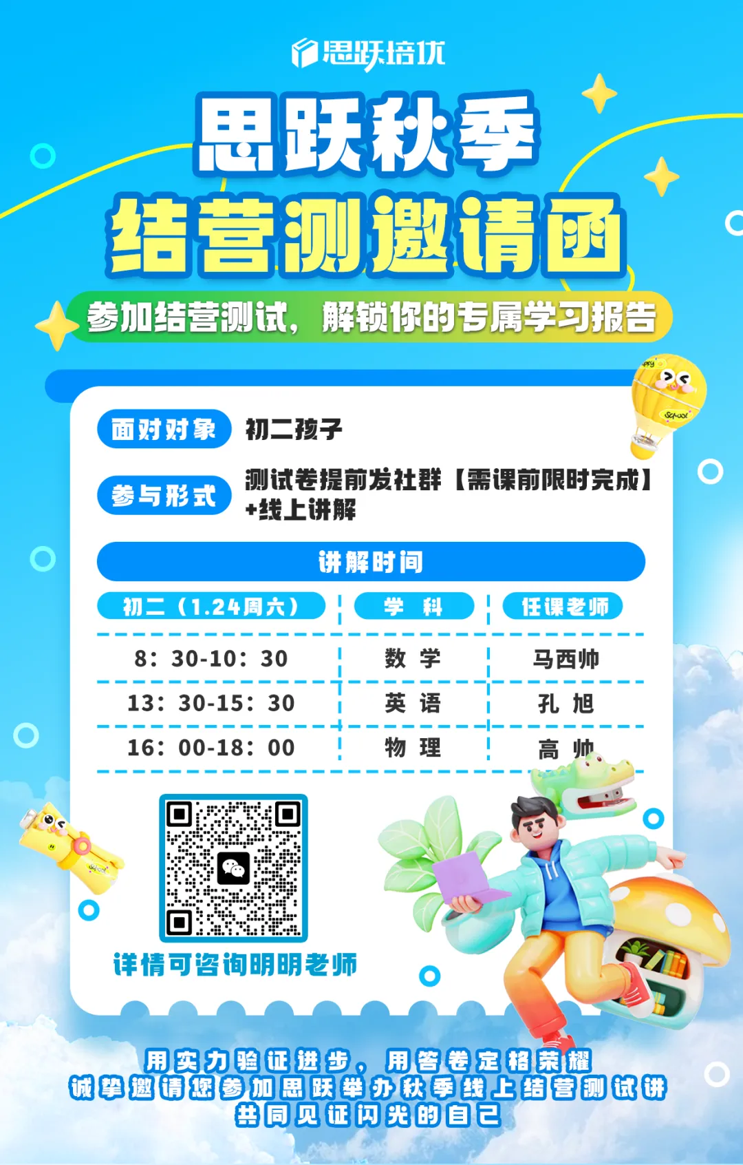 临近期末,优生圈给大家准备了八年级数学、物理、英语模拟试题,并且在1月24日会三个科目的线上讲解,可以扫描文中二维码添加明明老师参与活动。