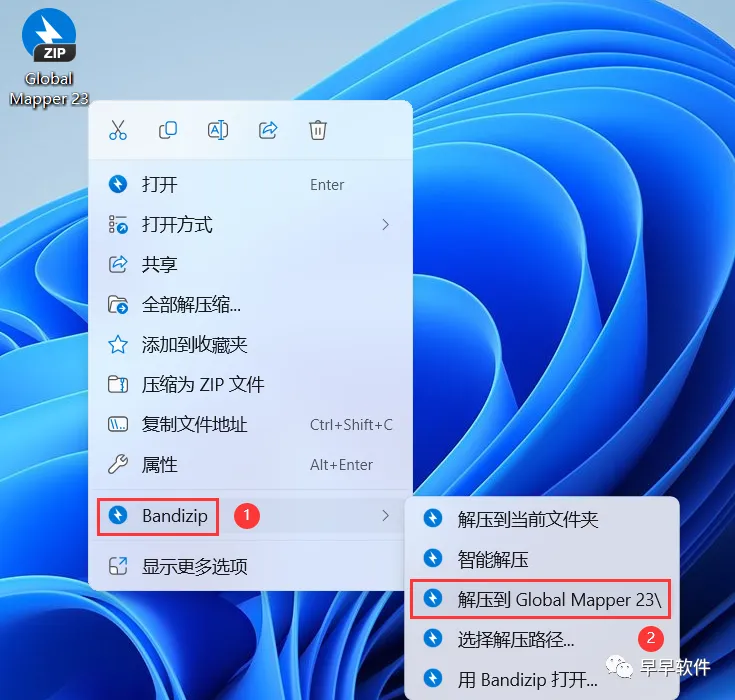 1、下载Global Mapper 23软件安装包到电脑上,右键选择【解压到Global Mapper 23\】