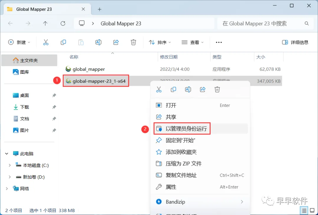 3、找到【global-mapper-23_1-x64】应用程序,右键选择【以管理员身份运行】它
