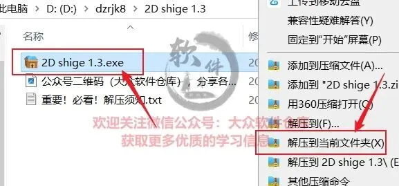 1.把资源从网盘下载到电脑上面,右键2D shige 1.3.exe压缩包选择解压到当前文件夹;