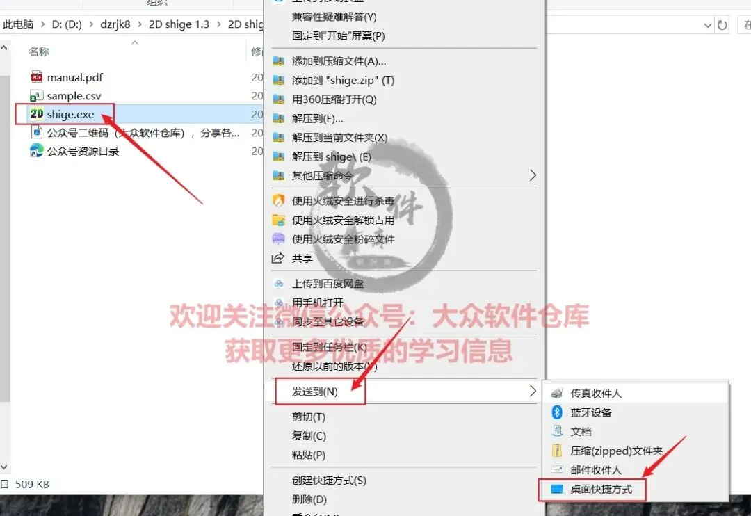 3.右键shige.exe程序选择发送到桌面快捷方式;
