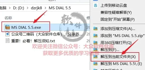 1.把资源从网盘下载到电脑上面,右键MS DIAL 5.5.exe压缩包选择解压到当前文件夹;
