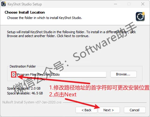 7.先修改路径地址中的首字符C可更改安装位置(如:将C改为D表示安装到D盘),再点击【Next】