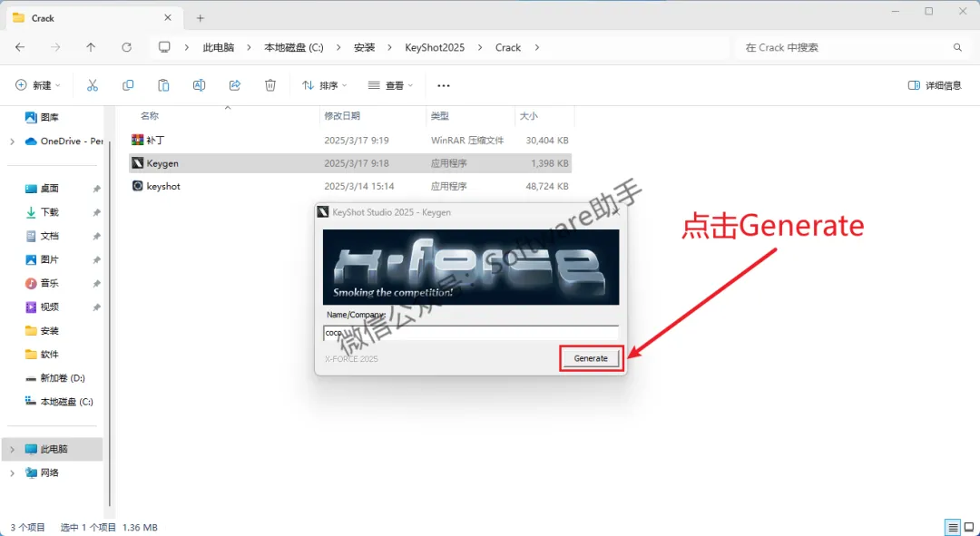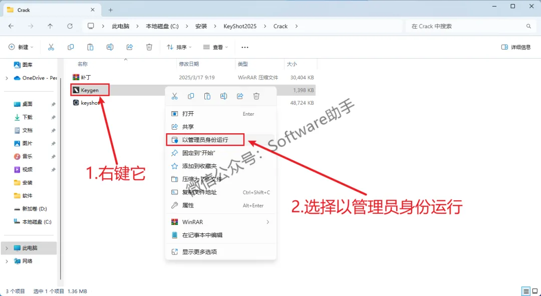 17.继续在打开的【Crack】文件夹中,鼠标右击【Keygen】选择【以管理员身份运行】