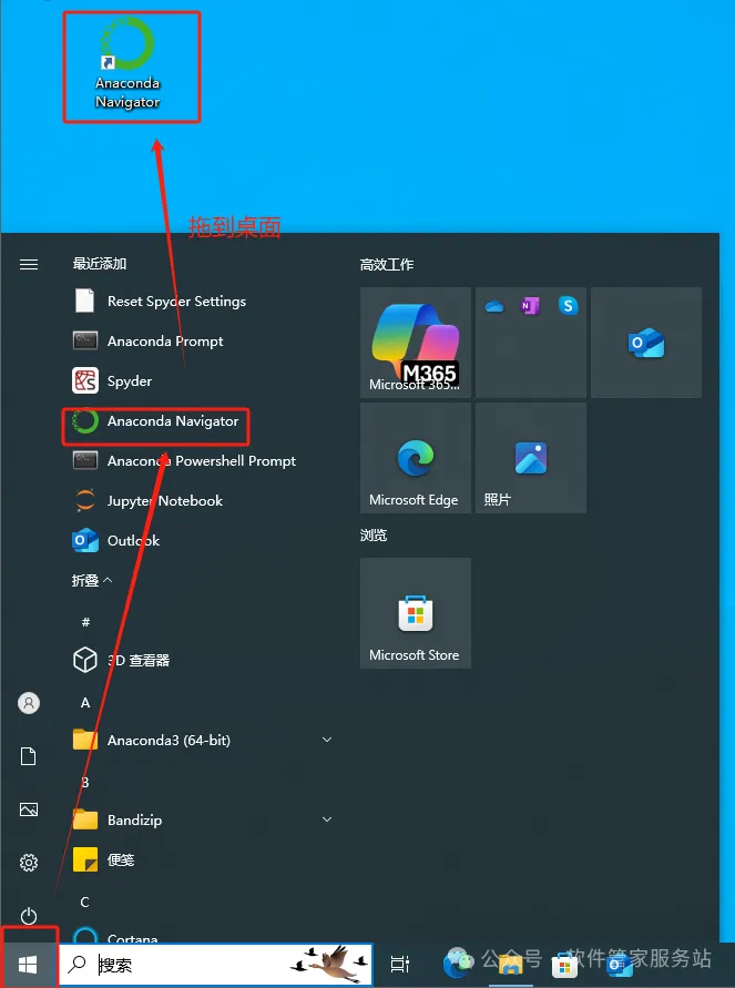第十三步:点开始,找到最近安装的程序,找到anaconda,将图标拖到桌面。