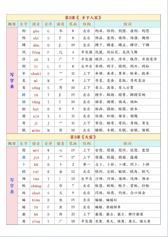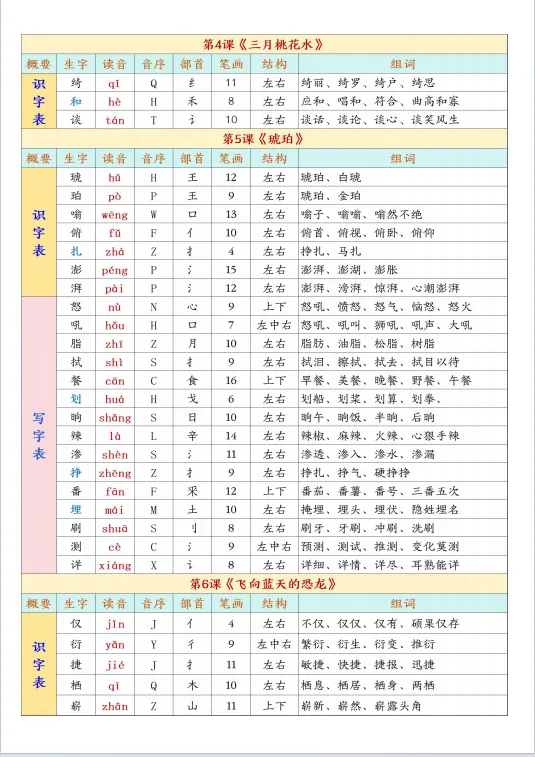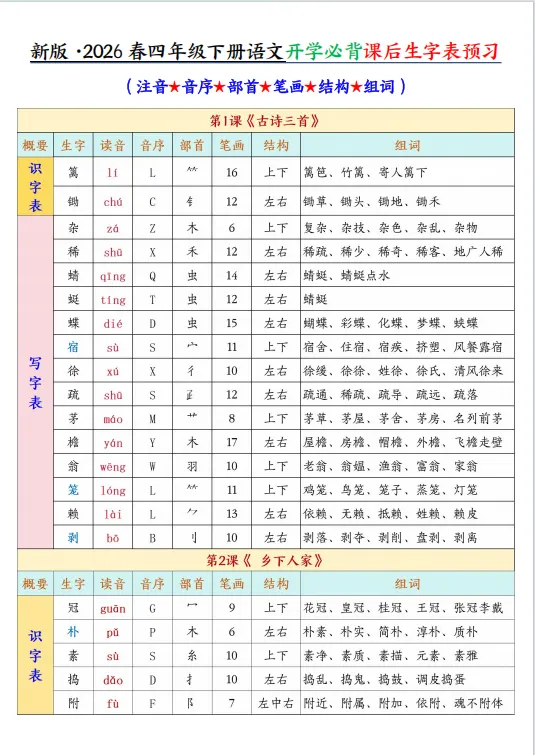 【免费下载】新版2026春四年级下册语文开学必背彩色《课后生字预习卡》共15页可直接打印注音音序等都包含在内先收藏好!以免找不到