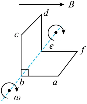 ”形导线框置于磁感应强度大小为B、水平向右的匀强磁场中。线框相邻两边均互相垂直,各边长均为l。线框绕b、e所在直线以角速度