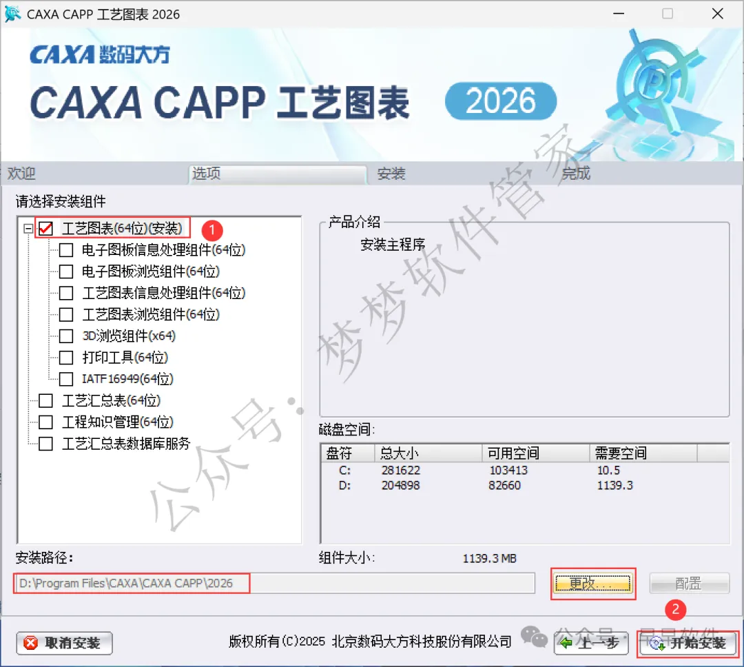 6、软件默认安装在C盘,可自定义更改软件安装位置,这里小编选择安装在D盘;勾选需要安装的组件,再点击【开始安装】