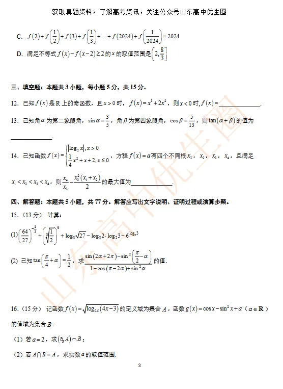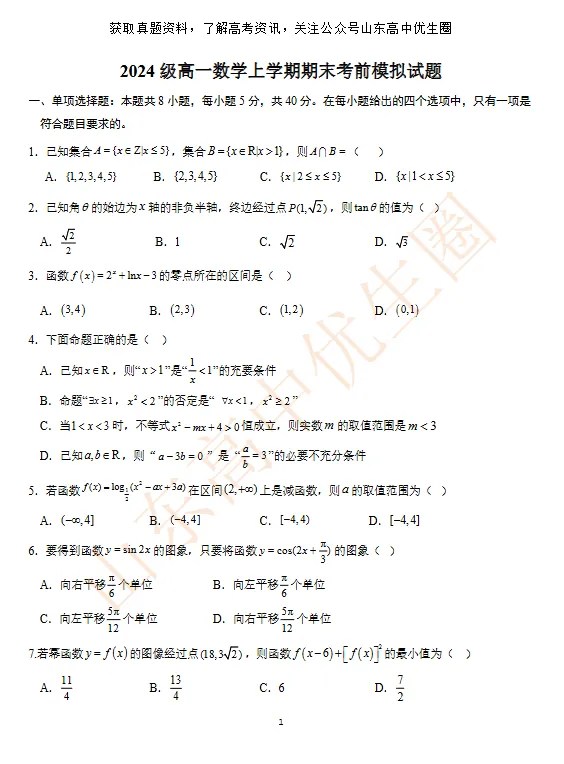 临近期末,优生圈整理了24-25学年西城实验高一上学期数学期末模拟试题