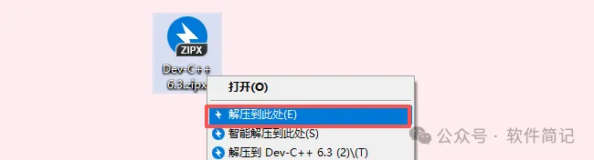 1.解压安装包:①鼠标右击【Dev-C++6.3】压缩包②点击【解压到当前文件夹(此处)】