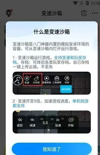 1、变速沙箱运行游戏,支持变速和玩家存档。
