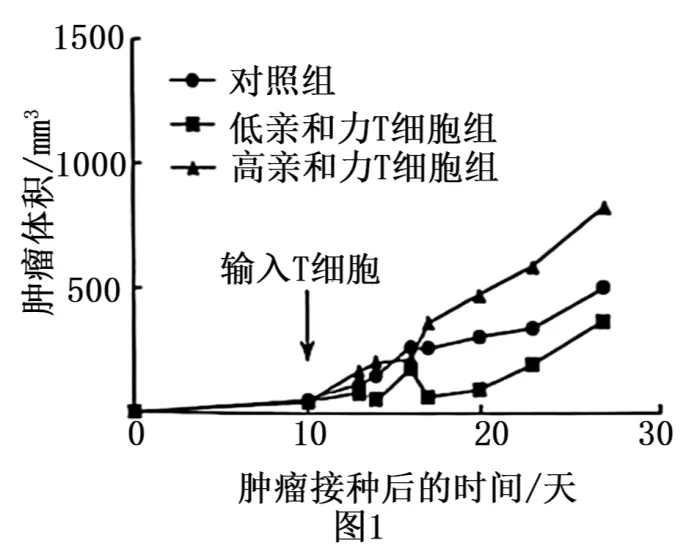 17.T细胞通过T细胞受体(TCR)识别肿瘤抗原,为研究TCR与抗原结合的亲和力对肿瘤生长的影响,将高、低两种亲和力的特异性T细胞输入至肿瘤模型小鼠,检测肿瘤生长情况(图1)及评估T细胞耗竭程度(图2)。T细胞耗竭指T细胞功能下降和增殖能力减弱,表达耗竭标志物的T细胞比例与其耗竭程度正相关。下列叙述正确的是()