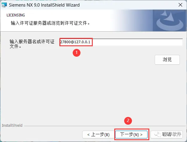 19、许可证文件输入:27800@127.0.0.1,再点击【下一步】