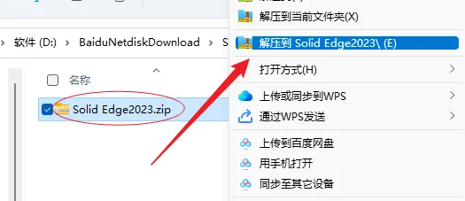 1.解压安装包:鼠标右击【Solid Edge2023】压缩包,选择电脑上安装的解压软件,点击【Solid Edge2023 】。