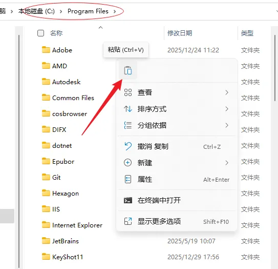 17.打开C盘路径:【C:\Program Files】,鼠标右击空白处选择【粘贴】。