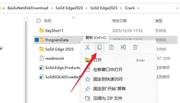 18.继续回到【Crack】文件夹,鼠标右击【ProgramData】文件夹鼠标右击选择【复制】。