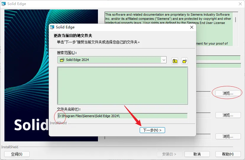 4.修改安装位置:①点击【浏览】②修改路径地址中的第一个字符C可更改安装位置(如:把C改为D软件将安装到D盘)③点击【下一步】。