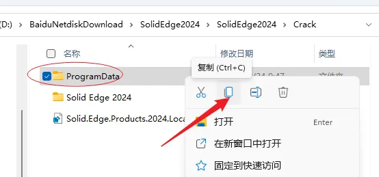 13.打开安装包解压后的【Solid Edge2024】文件夹中的【Crack】文件夹,鼠标右击【ProgramData】文件夹选择【复制】。