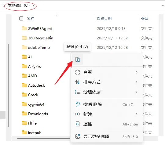 14.打开电脑C盘根目录,鼠标右击空白处选择【粘贴】。