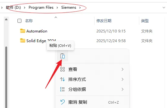 15.打开安装包解压后的【Solid Edge2024】文件夹中的【Crack】文件夹,鼠标右击【Solid Edge 2024】文件夹选择【复制】。