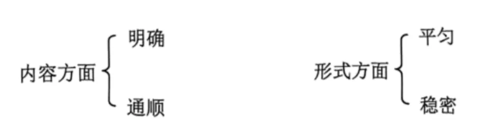 话语文章通例可以分为内容和形式两方面。内容方面是写说者所要表出的意思,形式方面是表出这意思的语言文字。所以消极的修辞,照例也可以分为两个部分。一个部分是偏重内容,如何才得把自己的意思明通地表出来,这个部分所注重的是意思之明通的表出法。另外一个部分是偏重形式,如何才得把自己的思想平稳地传达给别人,这个部分所着眼的是语言文字之平稳的使用法。要把意思明遇地表出来,在话语文章上就需要具备明确和通顺两条件,要把意思平稳地传给别人,在话语文章上就需要具备平匀和稳密两条件。这四端是消极修辞最低的限度,也是消极修辞所当遵守的最高标准。
