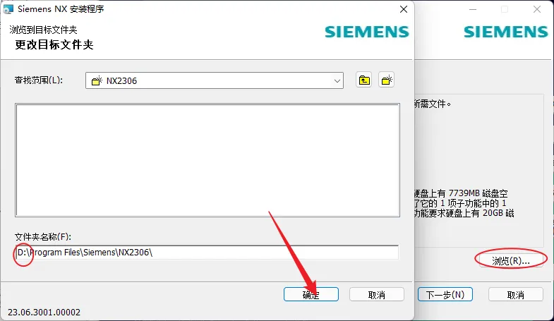 13.点击浏览,修改路径地址中的首字符C可更改安装位置,本例安装到D盘,点击确定。