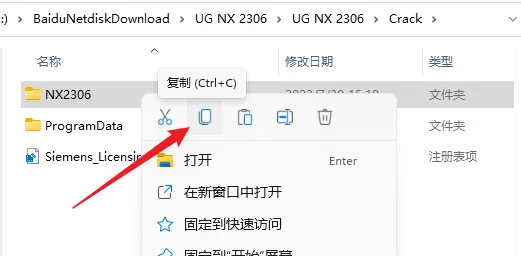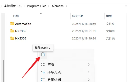 21.打开图示路径D:\Program Files\Siemens(第12步设置的路径),在空白处右键粘贴。