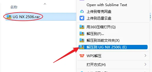 1.解压安装包:鼠标右击【UG NX 2506】压缩包,选择电脑上安装的解压软件,点击【UG NX 2506】。