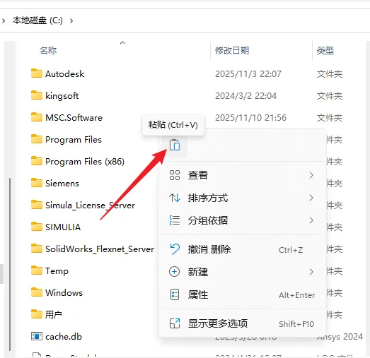 7.在C盘根目录空白处右键粘贴(ProgramData文件夹默认是隐藏的)。