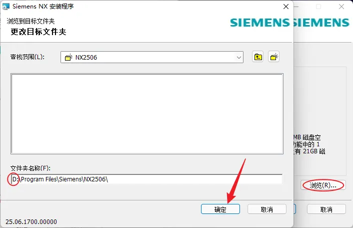 17.点击浏览,修改路径地址中的首字符C可更改安装位置,本例安装到D盘,点击确定。