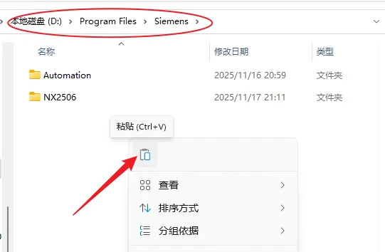 25.打开图示路径D:\Program Files\Siemens(第17步设置的路径),在空白处右键粘贴。