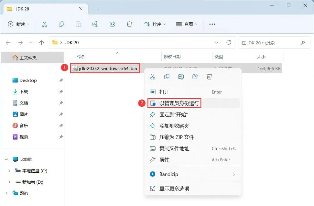 3、找到【jdk-20…x64】应用程序,右键选择【以管理员身份运行】它