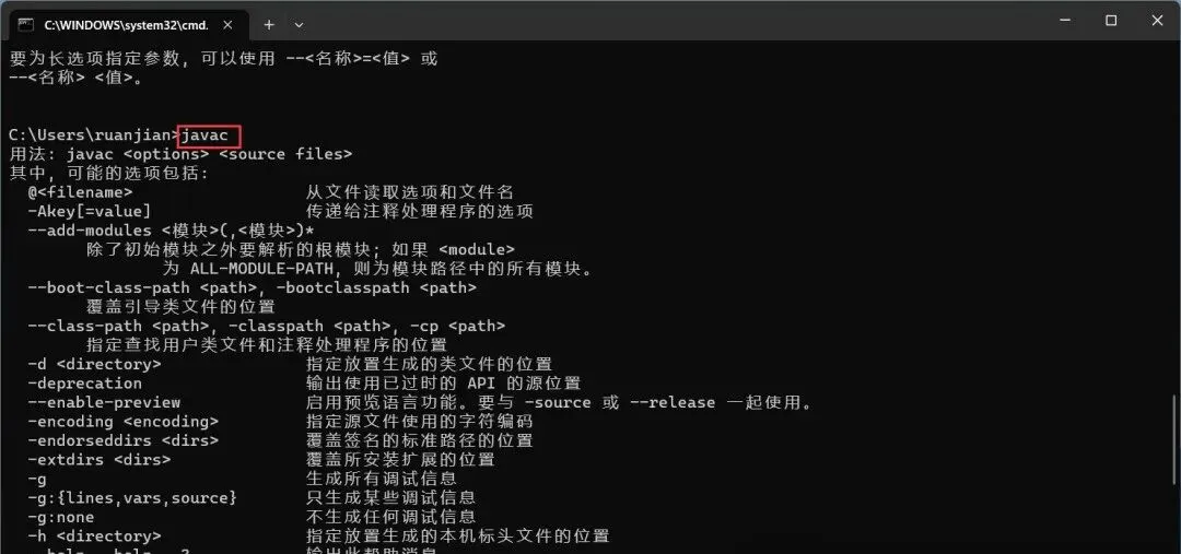 11、输入:javac,,按下键盘上的【Enter】回车键,得到下列反馈,则JDK安装及配置成功