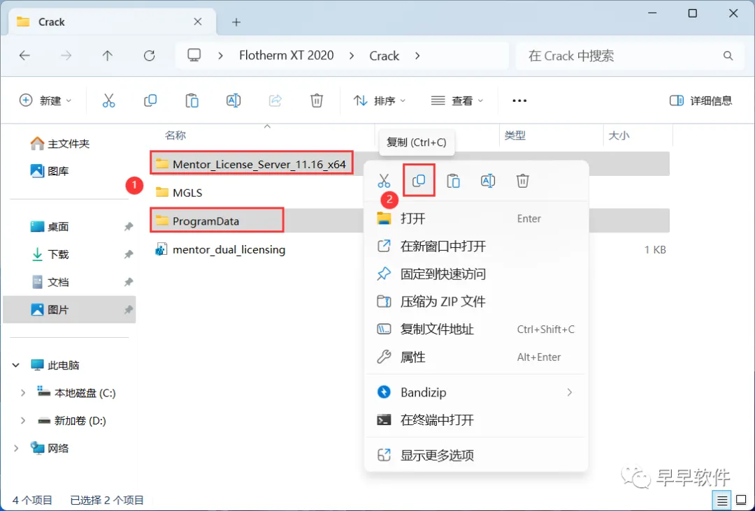 19、回到Crack文件夹,找到并选中【Nentor_License_Server…】和【ProgramData】文件夹,再右键点击【复制按钮】