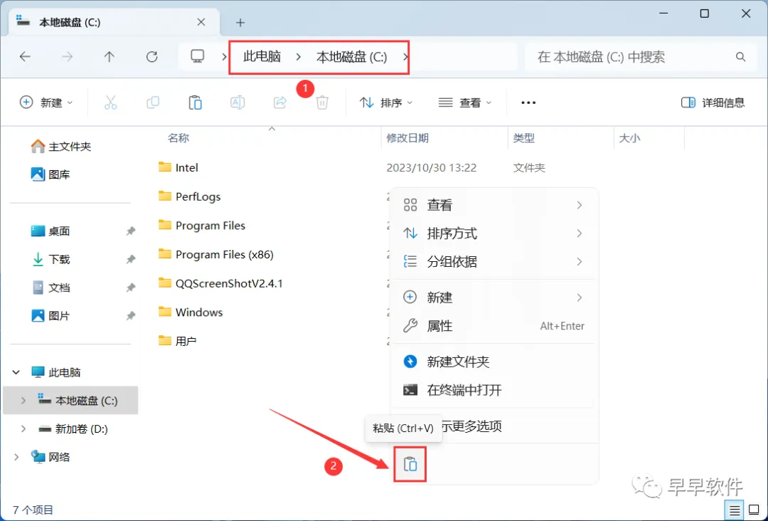 20、打开本地C盘,再右键文件夹的空白处,点击【粘贴按钮】