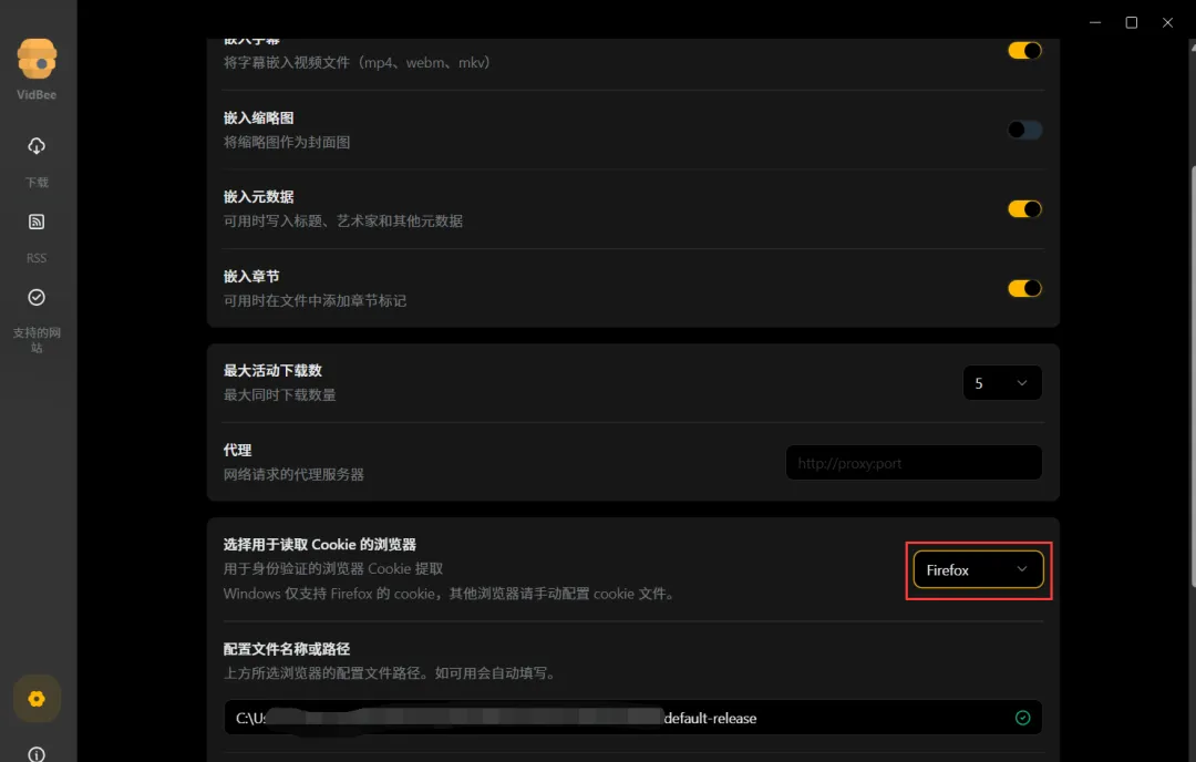 遇到这种情况,不要慌,可以在电脑中打开火狐浏览器(如果没有,下载安装火狐)中登录youtube,然后在VidBee的设置中,点击高级,选择用于读取Cookie的浏览器,Windows中只能用Firefox。