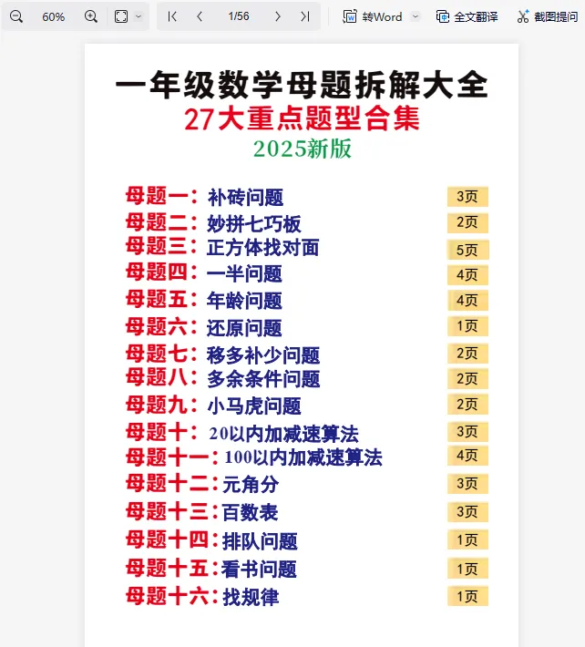 >一上数学母题大全,免费下载