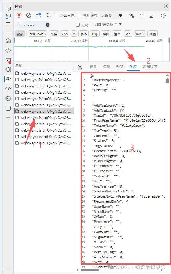 第三步:将视频号分享给文件助手,并执行如下图的操作,点击出来的链接,再点击右侧的响应(英文是 Response) ,将内容按 ctrl+a 全选,再按ctrl+c 复制出来。