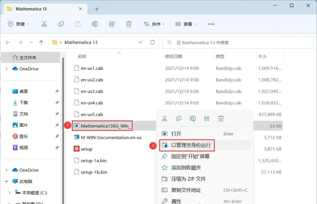 14、回到Mathematica 13文件夹,找到【Mathematica13KG】应用程序,右键选择【以管理员身份运行】它