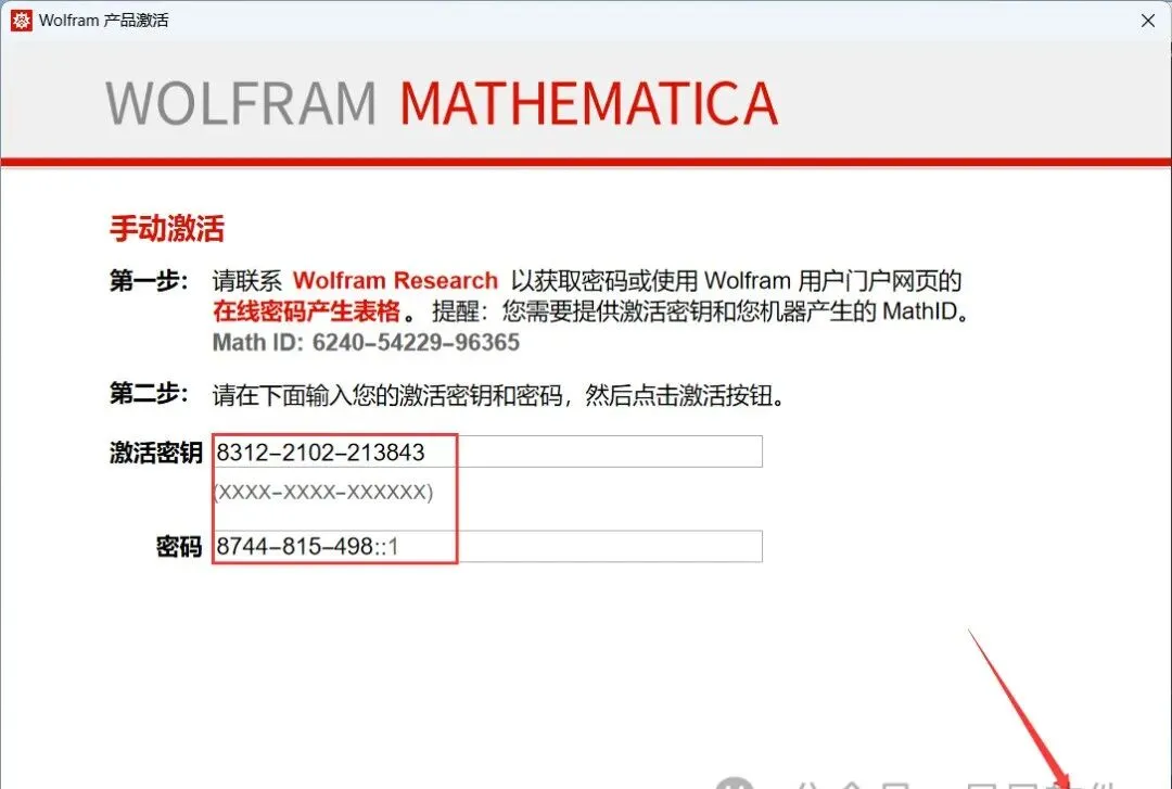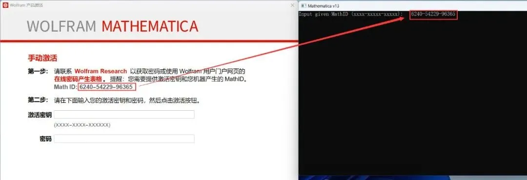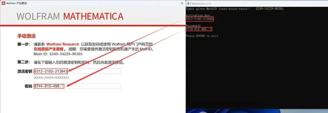 17、将Mathematica13KG程序中的【Activation Key】和【Password】值,一一对应输入到Mathematica 13软件的【激活秘钥】和【密码】中
