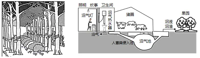 图左示意我国某热带雨林地区人工多层经济林模式,图右示意我国某地区“猪沼果”模式,二者均为生态农业模式。据此完成下列小题。