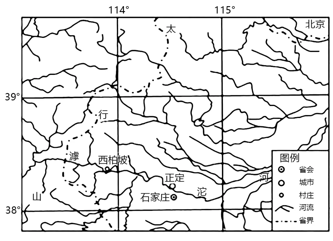 西柏坡是河北省平山县一个马蹄形山弯中的小山村,村前是开阔而肥沃的土地,村后是群山峻岭。平山有“北方的鱼米之乡”之称。据县志记载,平山“北岳控其东,太行踞其西…,右襟冶水,左带滹沱,万山峨峨,百川浩浩。”图为西柏坡区位图。据此完成下面小题。
