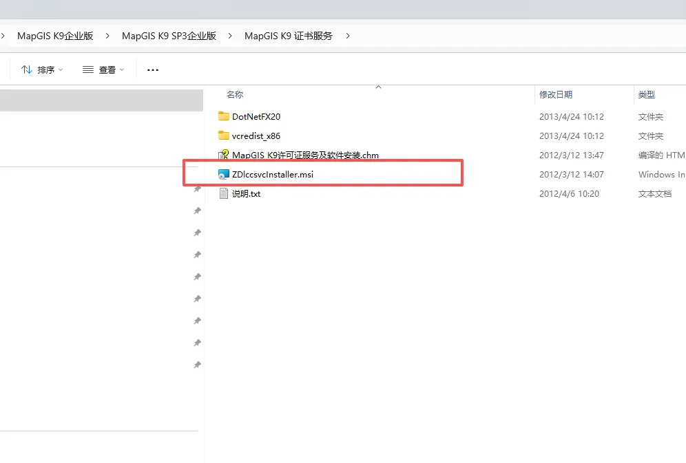 2.找到MapGIS K9 证书服务文件夹中的“ZDlccsvcInstaller.msi”,右键安装