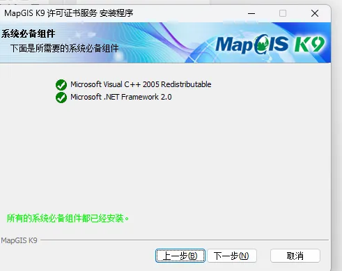 10.如果检测后都是绿色的对号则说明所需组件都具备了,点击下一步继续安装,安装完成后,先点击“安装许可证服务”,然后点击“启动许可证服务”