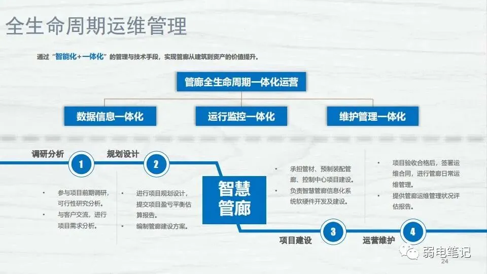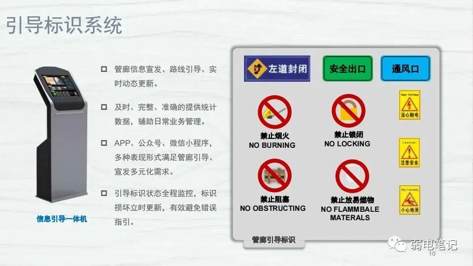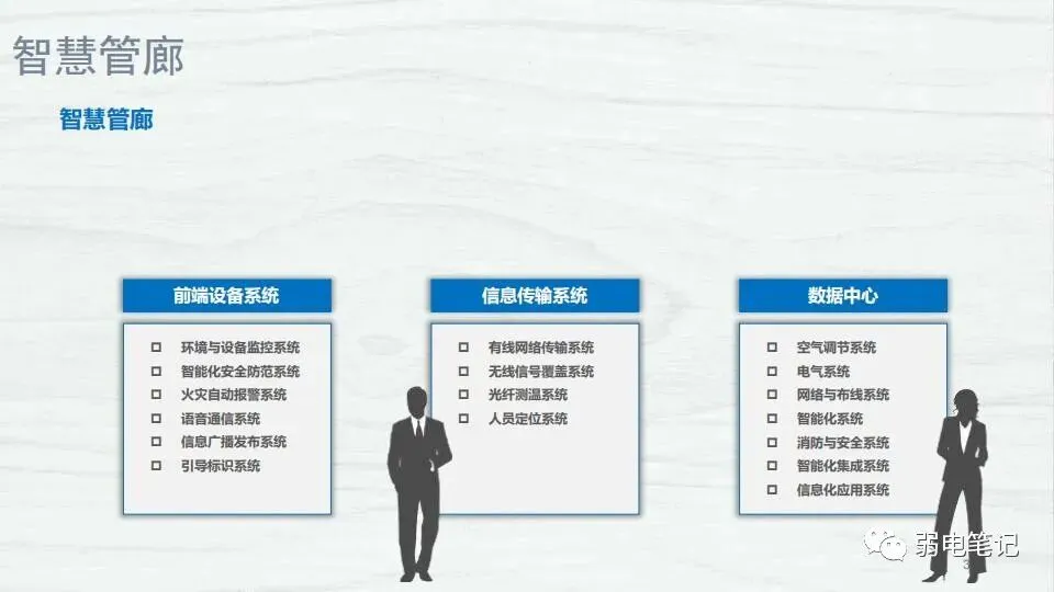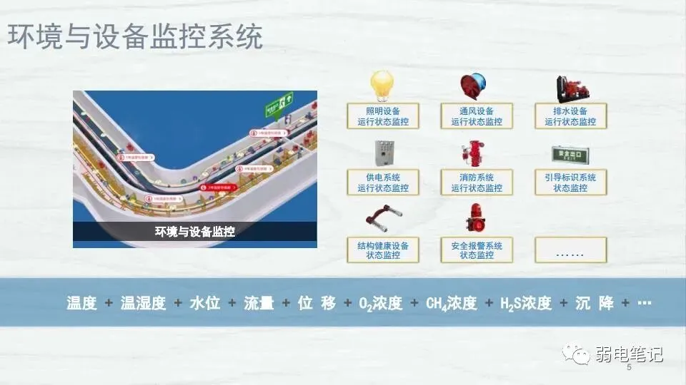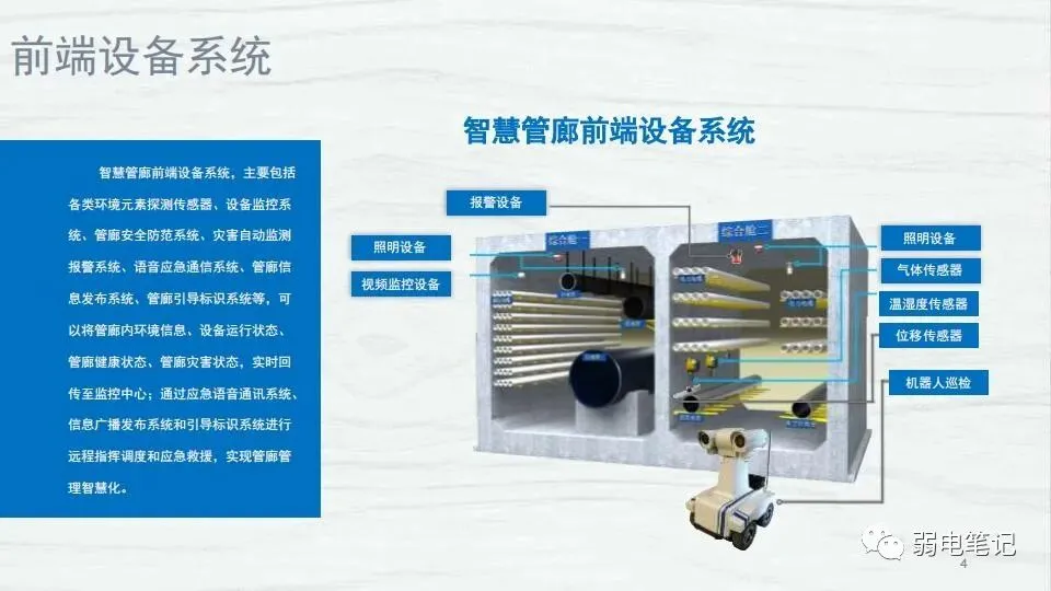 智慧管廊前端设备系统,主要包括各类环境元素探测传感器、设备监控系统、管廊安全防范系统、灾害自动监测报警系统、语音应急通信系统、管廊信息发布系统、管廊引导标识系统等。