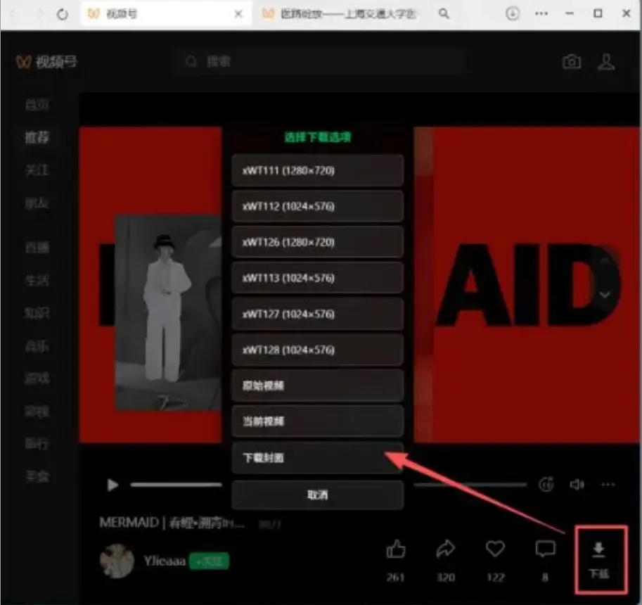 打开微信视频号首页,在视频下方操作栏中点击下载按钮,在弹出的菜单中选择下载选项: