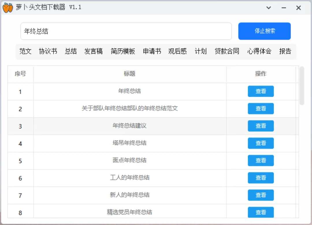 它是一个完全免费的文档下载工具,支持电脑端和手机端。界面简洁,操作简单,可以预览文档内容,一键下载到本地。年末了年终总结PPT在这上面找找,就很方便。