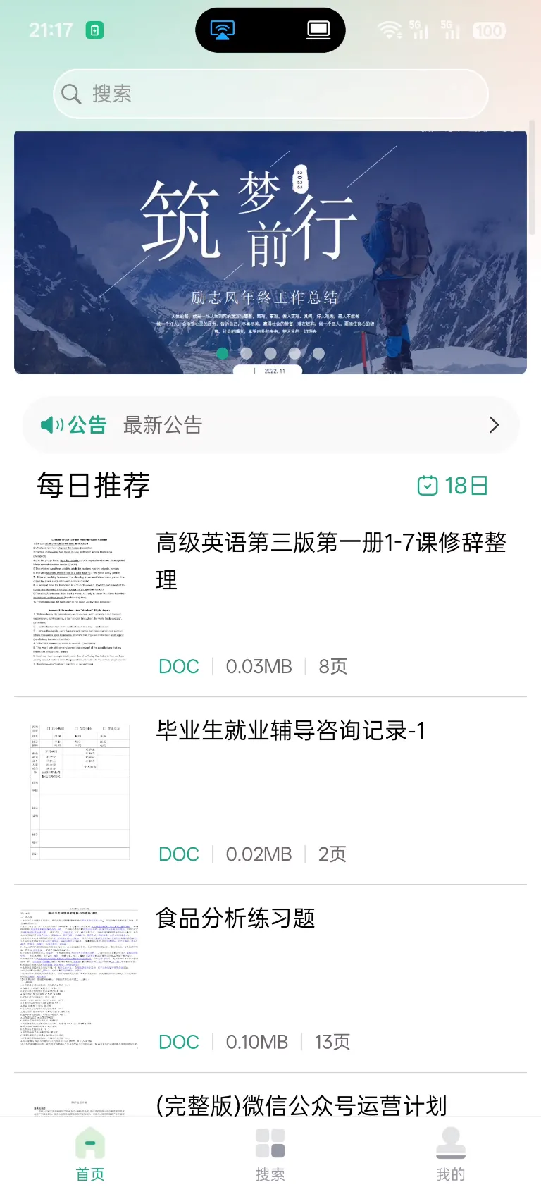 手机端的萝卜头文档下载器也很好用,主页有每日推荐,也可以通过搜索查找想要的文档。