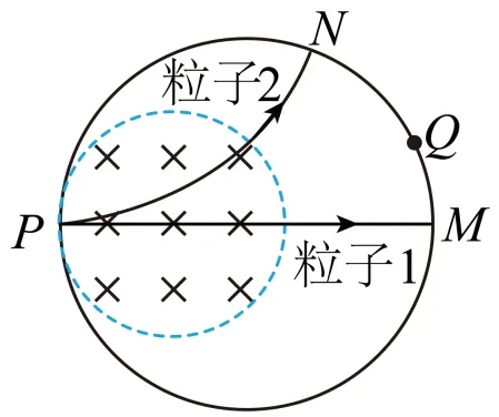 8. 粒子物理研究中使用的一种球状探测装置横截面的简化模型如图所示。内圆区域有垂直纸面向里的匀强磁场,外圆是探测器。两个粒子先后从P点沿径向射入磁场,粒子1沿直线通过磁场区域后打在探测器上的M点。粒子2经磁场偏转后打在探测器上的N点。装置内部为真空状态,忽略粒子重力及粒子间相互作用力。下列说法正确的是( )