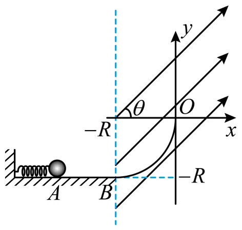 圆弧导轨在B点平滑连接,导轨半径为R。质量为m的带正电小球将轻质弹簧压缩至A点后由静止释放,脱离弹簧后经过B点时的速度大小为